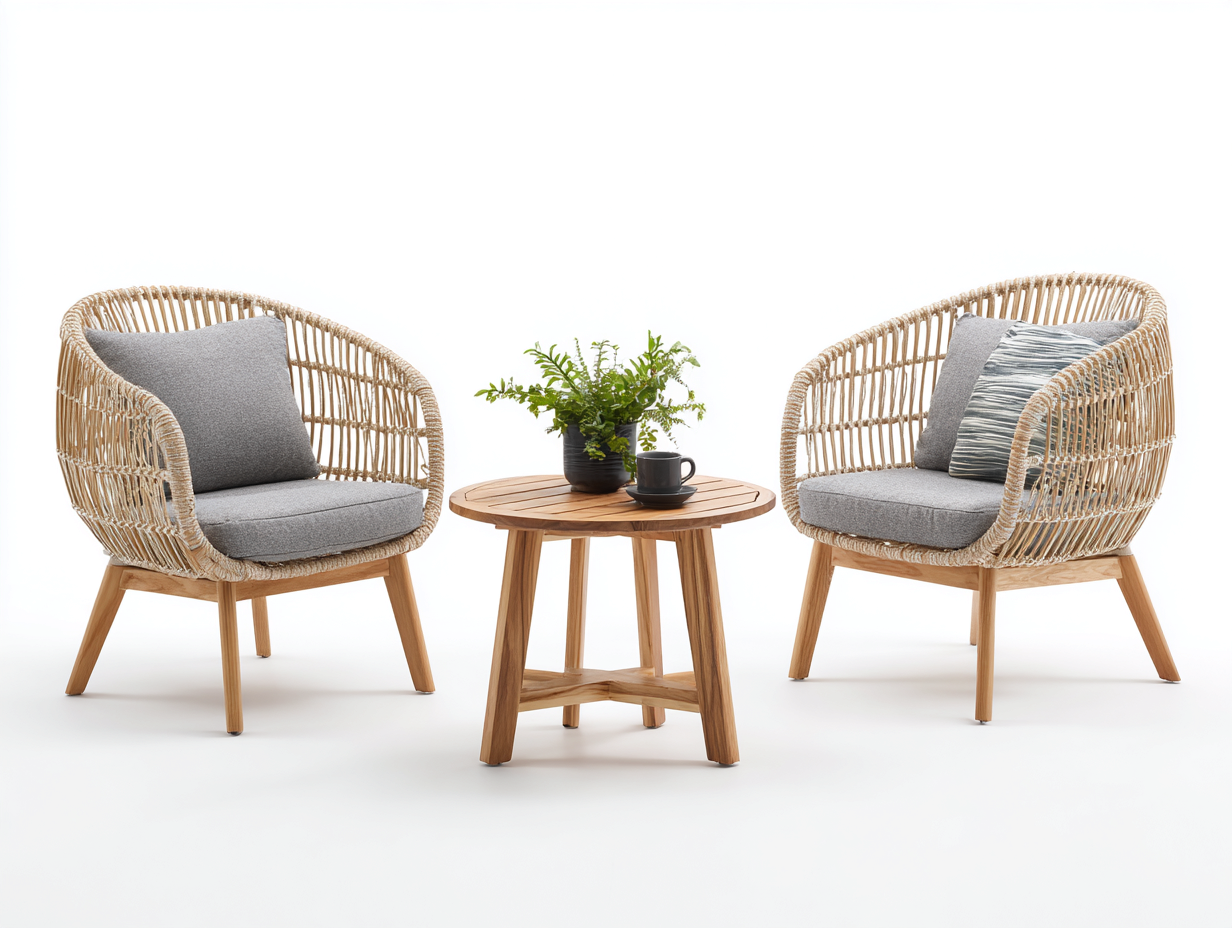 Salon de jardin pour terrasse en rotin naturel adapté à l'extérieur avec table ronde et fauteuils - coussins gris - style contemporain