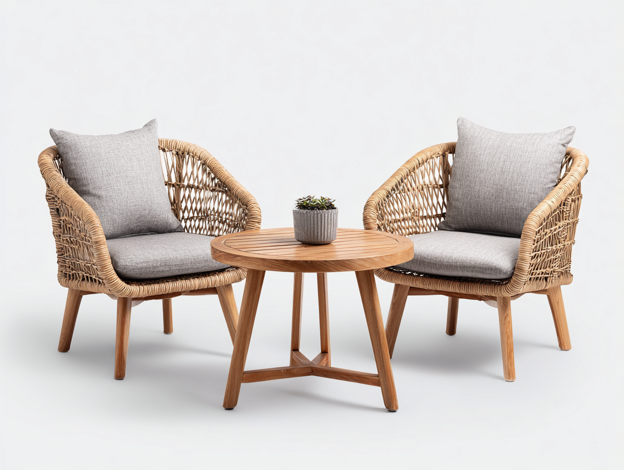 Salon de jardin pour terrasse en rotin naturel adapté à l'extérieur 2 fauteuils avec table ronde - coussins gris - style contemporain