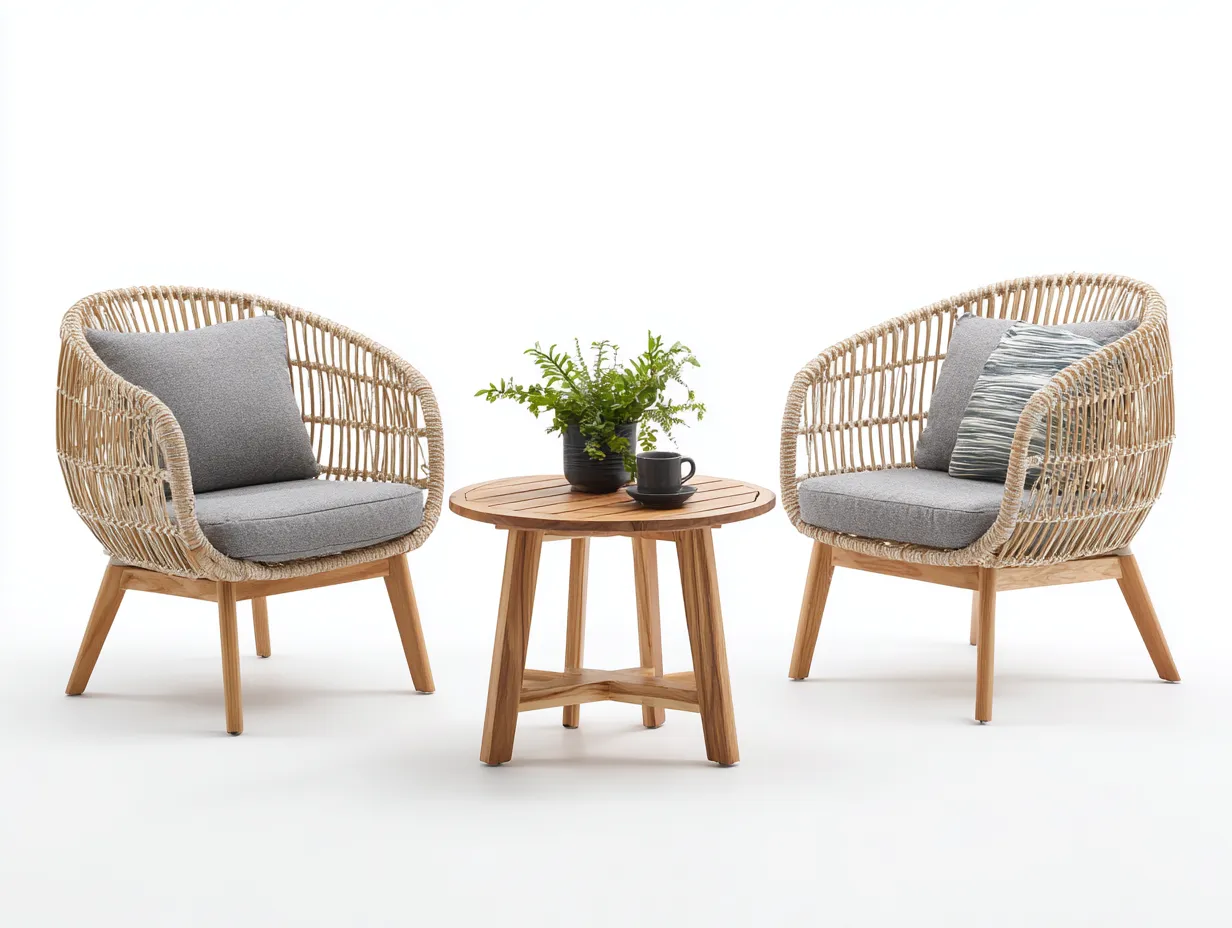 Salon de jardin pour terrasse en rotin naturel adapté à l'extérieur 2 fauteuils avec table ronde - coussins gris - style contemporain